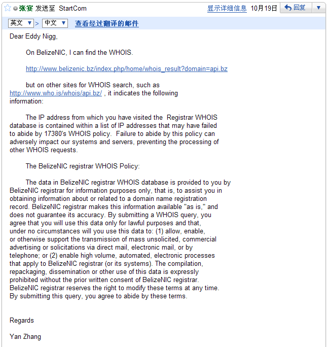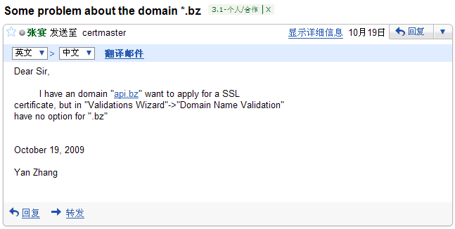 StartSSL虽然提供的是免费的SSL证书,但服务态度是非常不错的。之前StartSSL并不支持.bz结尾的域名,因为我有一个api.bz域名需要SSL证书,所以我发了份邮件给StartSSL的管理员,要求增加.bz域名,中间还因为.bz域名注册机构对whois查询有限制,出现了一些比较麻烦的问题,最终StartSSL通过修改程序,支持了.bz域名。